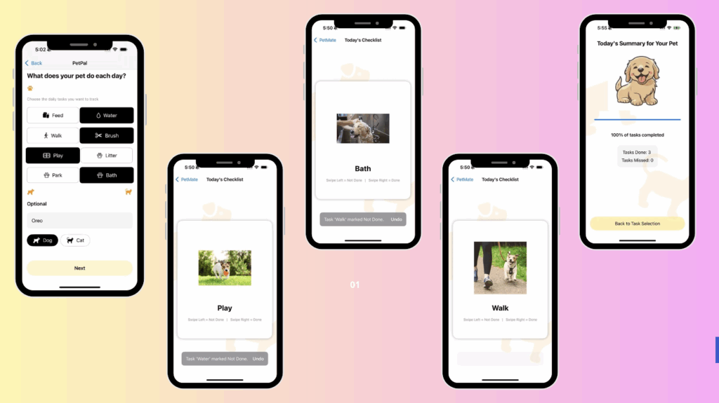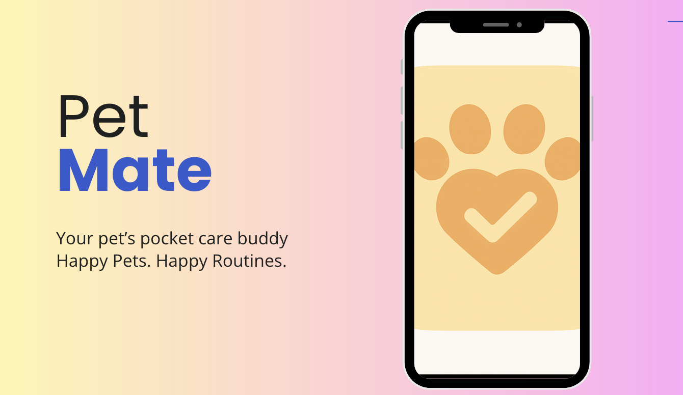 PetMate is an iOS mobile app designed to help pet owners easily track and manage their pets’ daily routines. The app makes pet care effortless with pre-set buttons for common routines (feeding, walking, grooming), a swipe-based task system to mark progress, and a playful daily tracker that shows a happy or sad pup face depending on completion. The vision was simple: Happy Pets, Happy Routines!