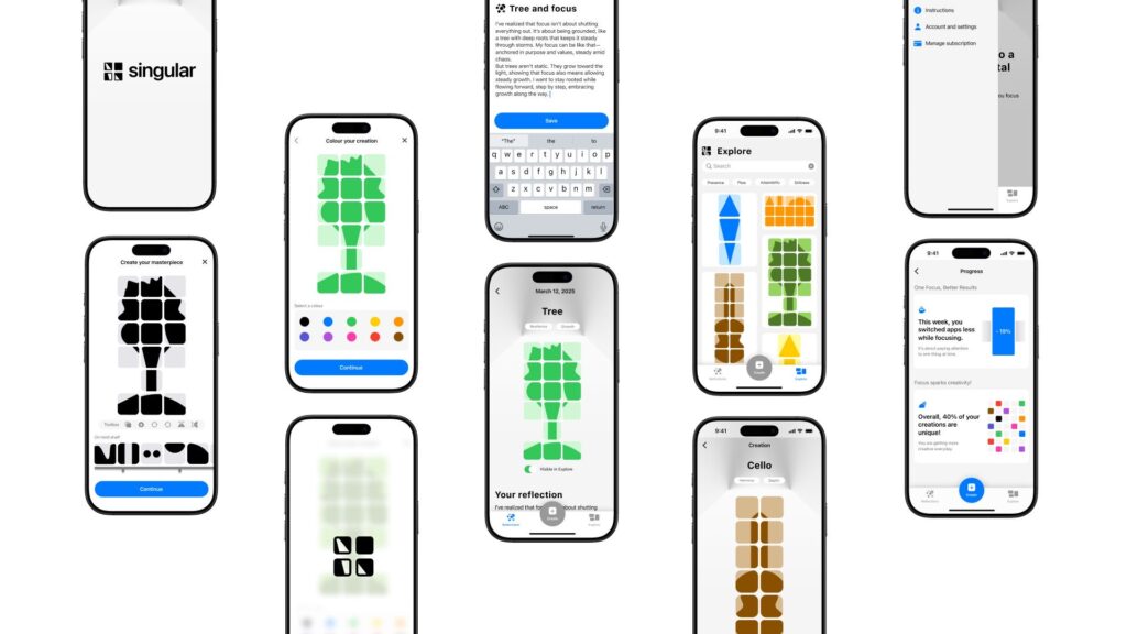 In a world of constant digital distractions, Singular helps 20–30 year olds retrain their focus, guiding them from a fuzzy to a mindful state. Instead of avoiding devices, it offers a creative experience on the phone. Users engage with 30 shape pieces to craft visuals—rotating, flipping, and shelving what’s unnecessary. AI links their creations to their focus state, sparking meaningful reflections stored for later. Community creations inspire new ideas, while users track how often they stay present without switching apps, and how their creative focus grows. Amazing things happen when you focus.