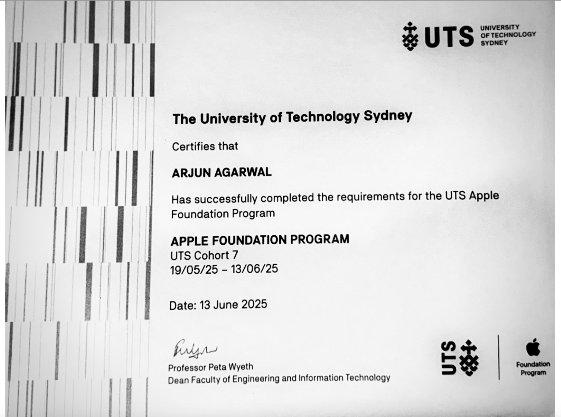 Selected as one of only 30 students university-wide, across all faculties, for a competitive, challenge-based learning program run by Apple in partnership with the University of Technology Sydney.